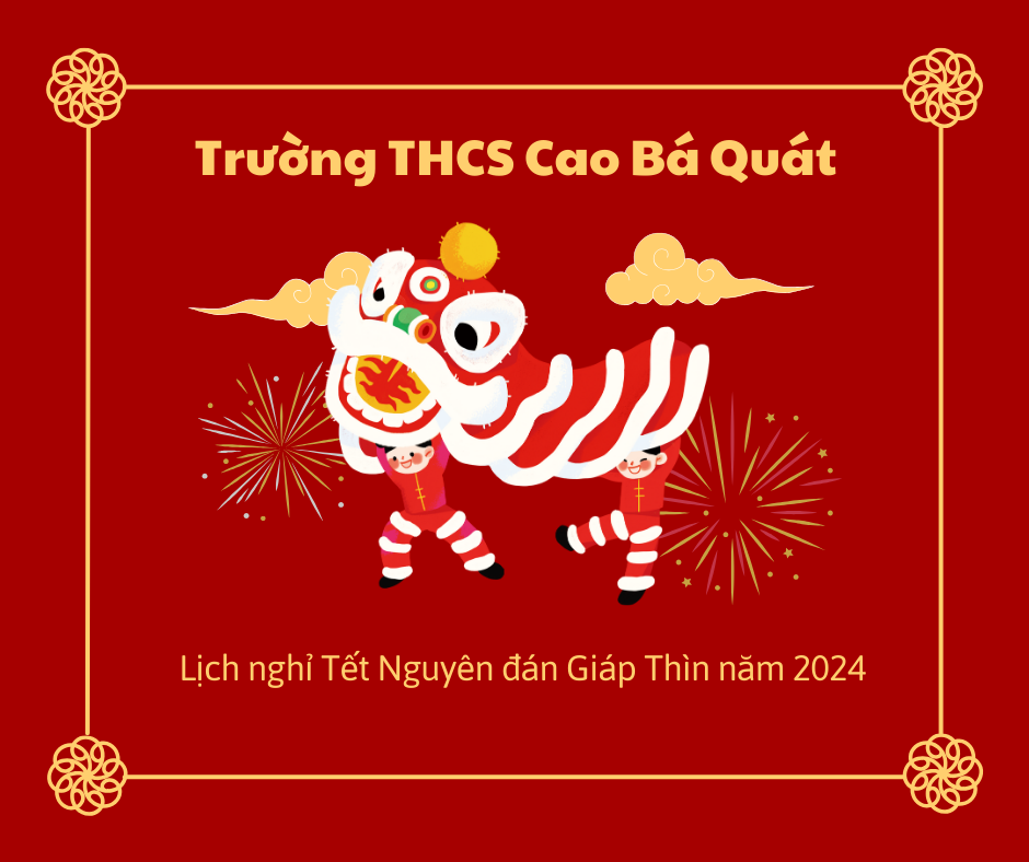 Thực hiện theo chỉ đạo của các cấp, Trường THCS Cao Bá Quát thông báo thời gian nghỉ tết Giáp Thìn năm 2024 từ ngày 07/02/2024 (thứ Tư) đến hết ngày 14/02/2024 (thứ Tư) (Tức là từ ngày 28 tháng Chạp năm Quý Mão đến hết ngày mùng 5 tháng Chạp năm Giáp Thìn), tổng cộng 8 ngày.