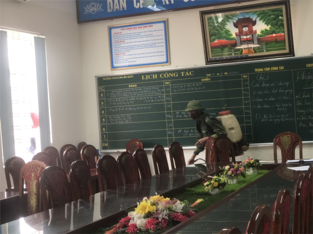 Thực hiện kế hoạch số 40/KH-YT ngày 31/01/2020 của UBND huyện về Phòng chống bệnh Viêm đường hô hấp cấp do chủng mới của viruts Corona (nCoV); Công văn số 165/UBND-GDĐT ngày 31/01/2020 của UBND huyện về việc tăng cường công tác phòng, chống dịch bệnh viêm đường hô hấp cấp; Tại trường THCS Cao Bá Quát sáng nay mồng 2 tháng 2 năm 2020 nhà trường đã phối kết hợp với trung tâm y tế xã Đặng Xái đã tiến hành tổng vệ sinh và phun thuốc sát khuẩn 100% lớp học, nhà thể chất, sân trường, hành lang, cầu thang, sân chơi, nhà vệ sinh, cửa, tay nắm cửa, tay vịn cầu thang, nền nhà, hành lang, các lphòng chức năng, khu hiệu bộ….Sau đây lsf một số hình ảnh phun thuốc tại trường THCS Cao Bá Quát.