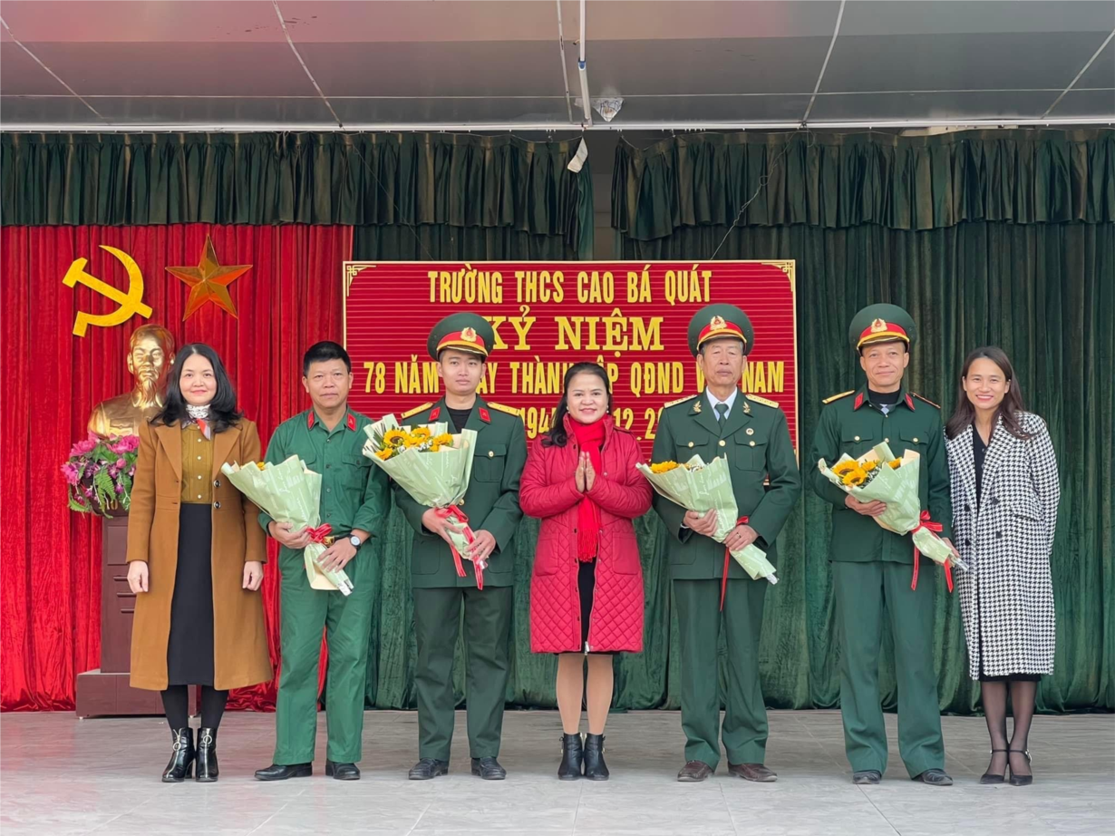 Với lời phát biểu mở đầu, đồng chí Vũ Thị Lan Anh- Bí thư Chi bộ, Hiệu trưởng nhà trường đã ôn lại truyền thống của Quân đội nhân dân Việt Nam anh hùng, đồng thời tri ân và vinh danh công lao to lớn của các chiến sĩ bộ đội đã đóng góp công sức, tuổi trẻ, chiến đấu vì độc lập tự do của Tổ quốc. Các thầy cô giáo của trường THCS Cao Bá Quát hiện nay đang đứng trên bục giảng đã và luôn là hậu phương vững chắc, nâng bước để chồng yên tâm công tác trong quân đội, bảo vệ nền hòa bình, độc lập tự do của Tổ quốc.
