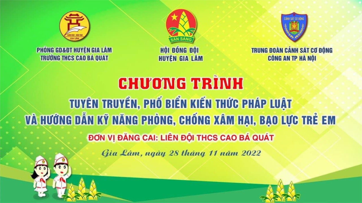 Thực hiện Chương trình Liên tịch của Đoàn Thanh niên Cộng sản HCM – Phòng GD&ĐT huyện Gia Lâm ngày 31/08/2022 về thực hiện chương trình công tác Đội và phong trào thiếu nhi huyện Gia Lâm năm học 2022 – 2023. Sáng ngày 28/11/2022, được sự nhất trí của Hội đồng Đội – Phòng GD&ĐT huyện Gia Lâm, Liên đội THCS Cao Bá Quát tổ chức chương trình Tuyên truyền, phổ biến kiến thức pháp luật và hướng dẫn kỹ năng phòng, chống xâm hại, bạo lực trẻ em.