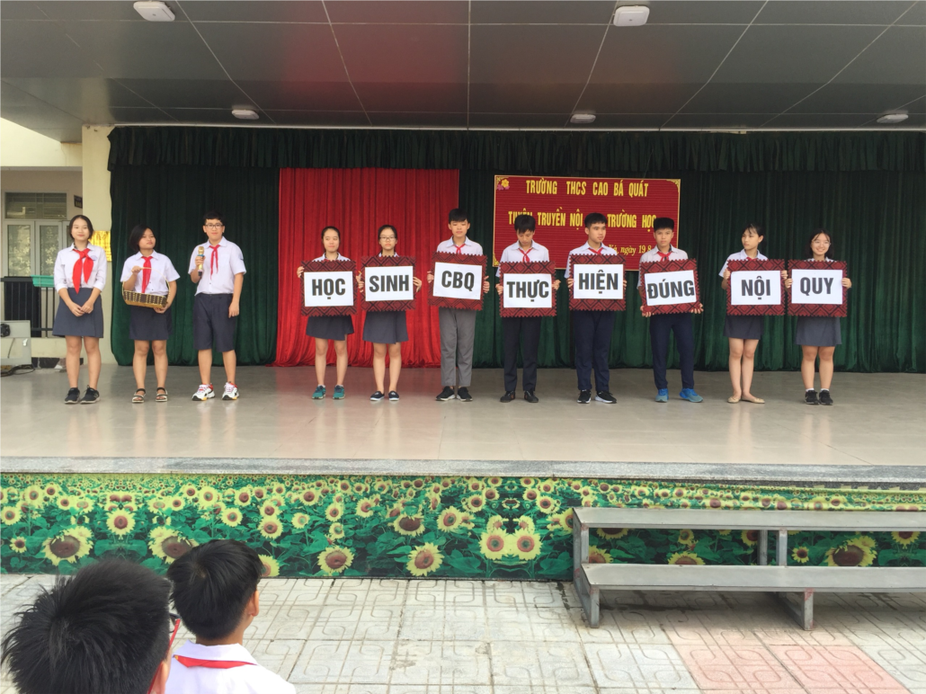Ngày thứ hai (19/08/2019) vừa qua, trong buổi chào cờ đầu tiên của năm học mới 2019 – 2020, Liên đội trường THCS Cao Bá Quát tổ chức buổi tuyên truyền nội qui nhà trường với sự tham gia trực tuần của chi đội 9A1.Với sự sáng tạo, trẻ trung, năng động của mình, những anh chị cả 9A1 đã đem tới buổi tuyên truyền những tiết mục vô cùng thú vị. Mở đầu buổi tuyên truyền là tiểu phẩm hài dí dóm, vui tươi. Những nội qui nhà trường tưởng chừng khô khan, cứng nhắc thông qua diễn xuất linh hoạt của các “diễn viên nhí” trở nên mềm mại, hài hước, dễ hiểu, dễ nhớ. Bên cạnh những tiếng cười sảng khoái, tiểu phẩm mang tới thông điệp: mặc đúng đồng phục khi đến trường, đi học đúng giờ, vào lớp theo hiệu lệnh trống.