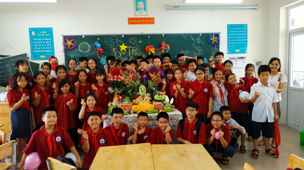 Được sự giúp đỡ của các bố mẹ, lớp 6A4 đã có một mâm cỗ Trung thu đầy đủ và nhiều màu sắc với màu đỏ của dưa hấu, màu vàng của dưa lê, màu cam của cà rốt, bí đỏ và màu hồng của trái Thanh Long, những bông hoa được các bố mẹ cắt tỉa xinh xắn cho một mâm cỗ đầy đủ.