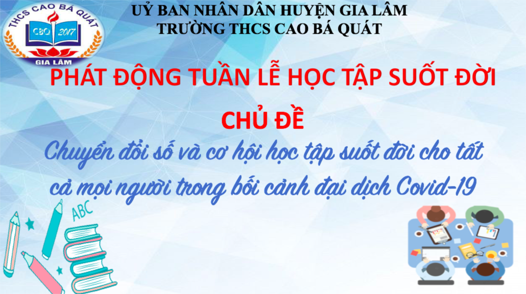 Trường THCS Cao Bá Quát đã phát động tuần lễ hưởng ứng học tập suốt đời đến toàn thể giáo viên học sinh trong trường với mục đích nâng cao nhận thức của nhân dân về chuyển đổi số, cơ hội học tập và xây dựng xã hội học tập, chia sẻ kinh nghiệm về học tập suốt đời cho tất cả mọi người trong bối cảnh đại dịch Covid-19. Việc học tập mang lại cho mọi người cuộc sống ý nghĩa hơn, sự hiểu biết không bao giờ là nhàm chán, khát khao tri thức của con người là vô hạn và giáo dục của nước ta được xem là quốc sách hàng đầu.