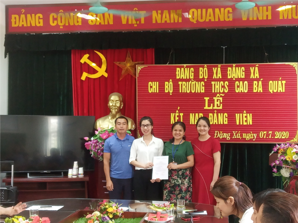 Sáng ngày 7/7, Chi bộ trường THCS Cao Bá Quát đã tiến hành tổ chức lế kết nạp đảng viên mới cho đồng chí Hoàng Thị Thuý Vân. Lễ kết nạp diễn ra trong không khí trang nghiêm và theo đúng các trình tự, thủ tục được quy định.