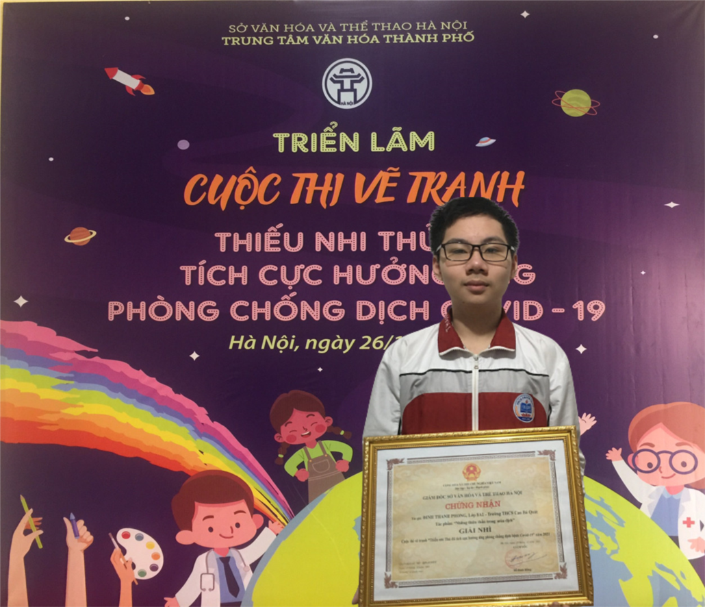 Trong những ngày nghỉ ở nhà để phòng chống dịch, bạn Đinh Thanh Phong đã tham gia cuộc thi vẽ tranh "Thiếu nhi Thủ đô tích cực hưởng ứng phòng chống dịch Covid-19" và đạt được giải Nhì. Với tiêu đề "Những thiên thần trong mùa dịch", bạn muốn đề cao và ca ngợi những công lao cùng sự hi sinh cao cả của các chiến sĩ, y bác sĩ, những anh hùng nơi tuyến đầu chống dịch. Qua bức tranh này, bạn Phong cũng như toàn thể lớp 8A1 muốn thể hiện sự biết ơn trân trọng đối với những người anh hùng ấy, mong rằng dịch bệnh qua đi để chúng ta cùng trở về cuộc sống bình thường, để không ai phải hi sinh hạnh phúc của mình, để ai ai cũng luôn nở nụ cười trên môi.