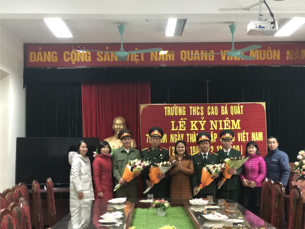 Với đạo lý “Uống nước nhớ nguồn” của dân tộc Việt Nam, thứ Hai 21/12/2020 ,Ban giám hiệu, Công đoàn trường THCS Cao Bá Quát đã tổ chức gặp mặt tri ân nhân viên là quân nhân dịp Kỷ niệm ngày thành lập Quân đội nhân dân Việt Nam 22/12.
