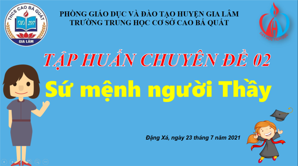 “Sứ mệnh người thầy” là chuyên đề thứ 2 trường THCS Cao Bá Quát được tập huấn với mong muốn “tiếp lửa” đổi mới cho các thầy cô giáo, trao cho thầy cô các phương pháp dạy học tích cực, hướng đến giáo dục toàn diện học sinh, thích ứng với những đòi hỏi của đổi mới giáo dục.