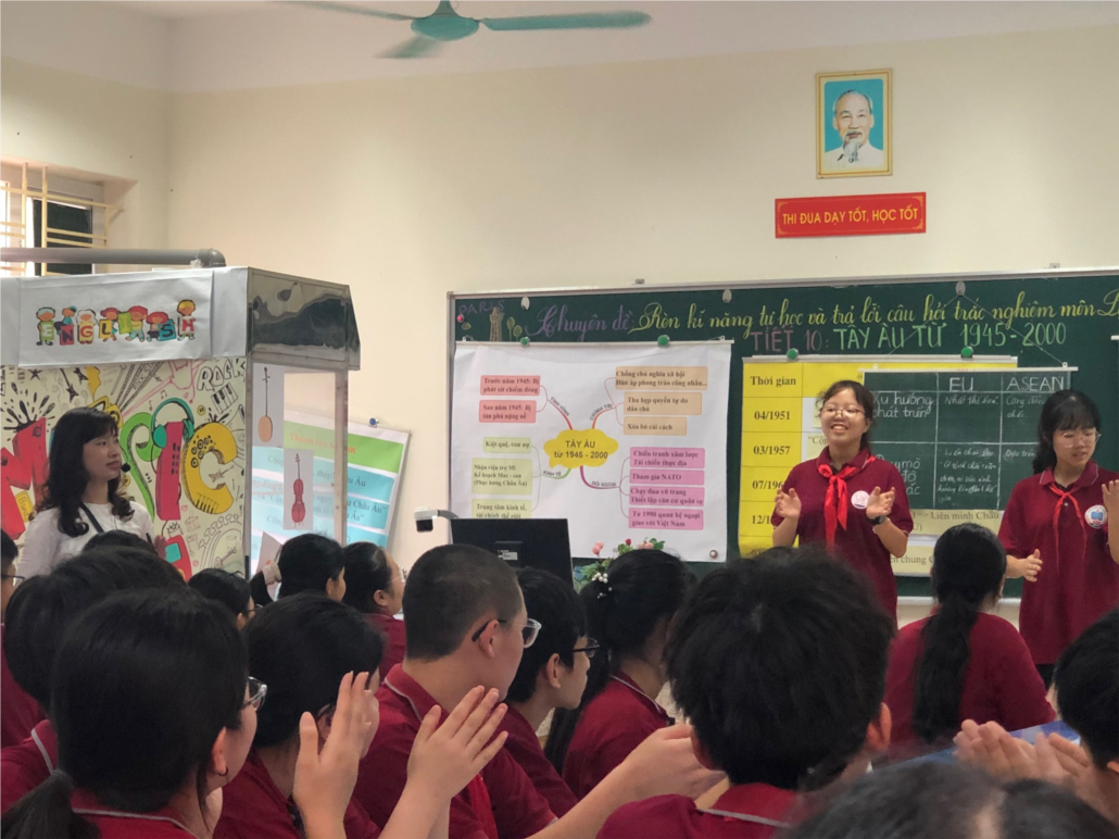 Thông qua việc thực hiện chuyên đề: “ Rèn kĩ năng tự học và trả lời câu hỏi trắc nghiệm môn Lịch sử”, cô giáo Nguyễn Thị Thu Hoài đã xây dựng một giờ dạy kết hợp nhiều phương pháp dạy học, tổ chức các hoạt động giúp học sinh chủ động lĩnh hội kiến thức. Cô giáo đã tổ chức các hoạt động ôn tập, rèn kĩ năng cho học sinh dưới nhiều hình thức khác nhau; tổ chức cho học sinh thuyết trình về các sản phẩm tổng kết các nội dung kiến thức đã học (sơ đồ tư duy, power point, video). Bên cạnh đó, cô giáo chia sẻ một số phương pháp hệ thống hóa kiến thức một cách khoa học, cách thức tổ chức hoạt động ôn luyện kiến thức cùng những tài nguyên là các bảng biểu, các phần mềm hỗ trợ. Đặc biệt, cô giáo trao đổi những kinh nghiệm tổ chức các hoạt động ôn tập, rèn kĩ năng cho học sinh làm tốt phần trắc nghiệm ở 4 cấp độ: nhận biết, thông hiểu, vận dụng và vận dụng cao.